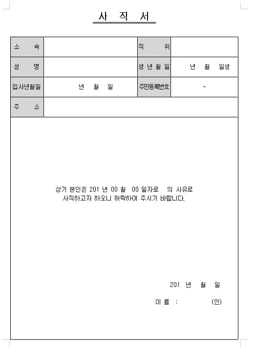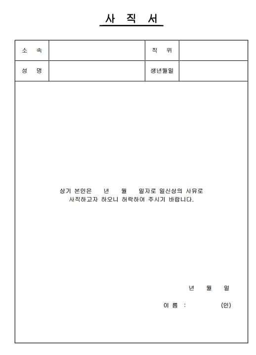 만약 회사 내에서 사직서 양식을 찾을 수 없다면 아례 양식을 참고하셔서 사용하시기 바랍니다.