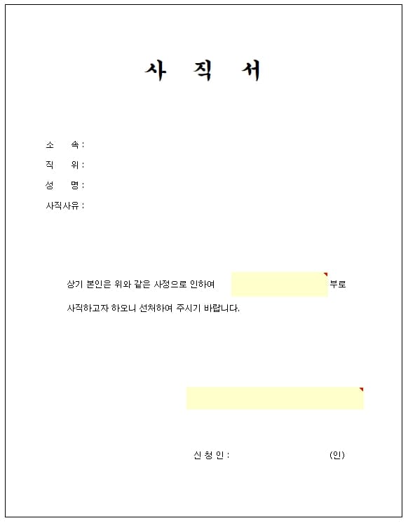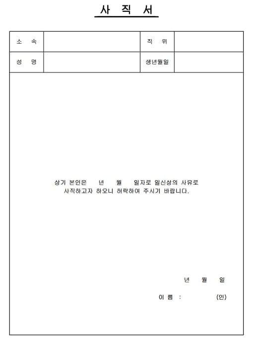 회사 내에 별도의 사직서 양식이 있다면 해당 규격에 맞게 작성하면 되지만 일부 중소기업이나 영소한 자영업자의 경우 별도의 양식이 없는 경우가 있습니다.